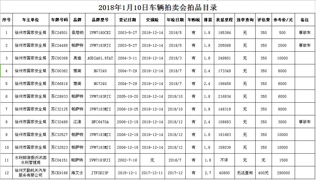 關(guān)注微信公眾號我公司受委托,定于2018年1月10日10時在徐州市中山南路55號三樓本公司拍賣大廳公開拍賣各型汽車11輛。主要有帕薩特6輛、雅閣2輛、奧迪1輛、桑塔納1輛、江淮1輛。