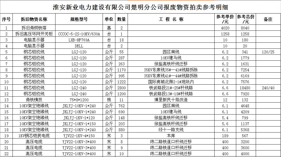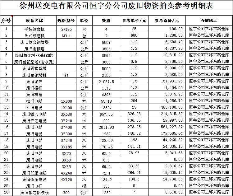 關(guān)注微信公眾號受江蘇徐供、淮供集體資產(chǎn)運(yùn)營中心委托,我公司將通過中國拍賣行業(yè)協(xié)會(huì)網(wǎng)絡(luò)拍賣平臺以網(wǎng)絡(luò)競價(jià)的方式公開拍賣以下單位的廢舊物資各一批: