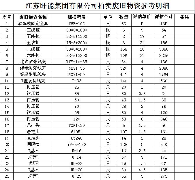 關注微信公眾號受江蘇盱能集團有限公司委托,我公司將通過中國拍賣行業(yè)協(xié)會網(wǎng)絡拍賣平臺以網(wǎng)絡競價的方式公開拍賣廢舊物資一批,主要包括:電纜、金具、線管、開關等(詳見拍品目錄)。