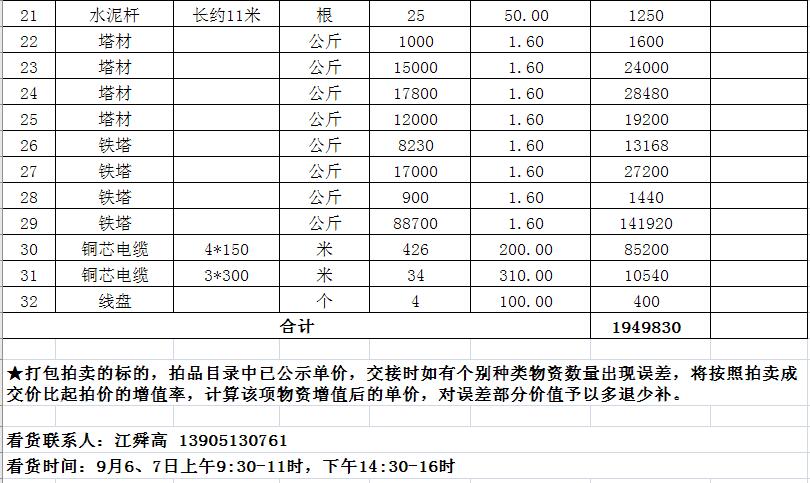 拍賣標(biāo)的主要包括:鐵塔、角鋼塔、鋼管桿、鋼芯鋁絞線、電纜、變壓器、金具等。