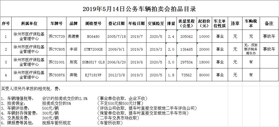 關(guān)注微信公眾號(hào)受委托,我公司定于2019年5月14日10時(shí)在徐州市中山南路55號(hào)本公司拍賣廳通過(guò)現(xiàn)場(chǎng)和中國(guó)拍賣行業(yè)協(xié)會(huì)網(wǎng)絡(luò)拍賣平臺(tái)結(jié)合拍賣的方式公開拍賣以下車輛: