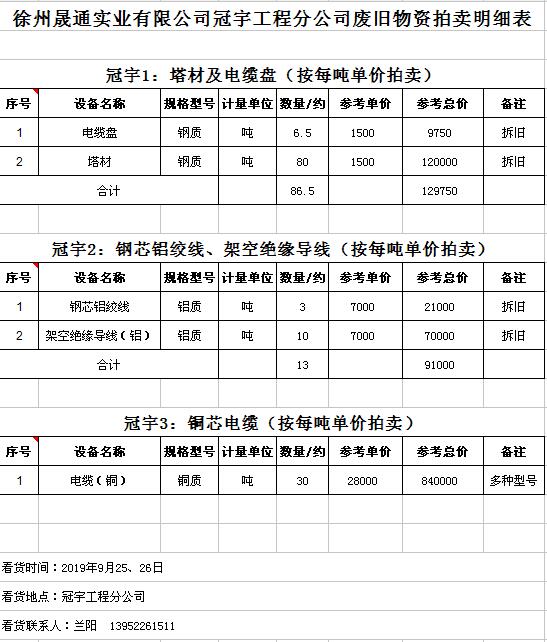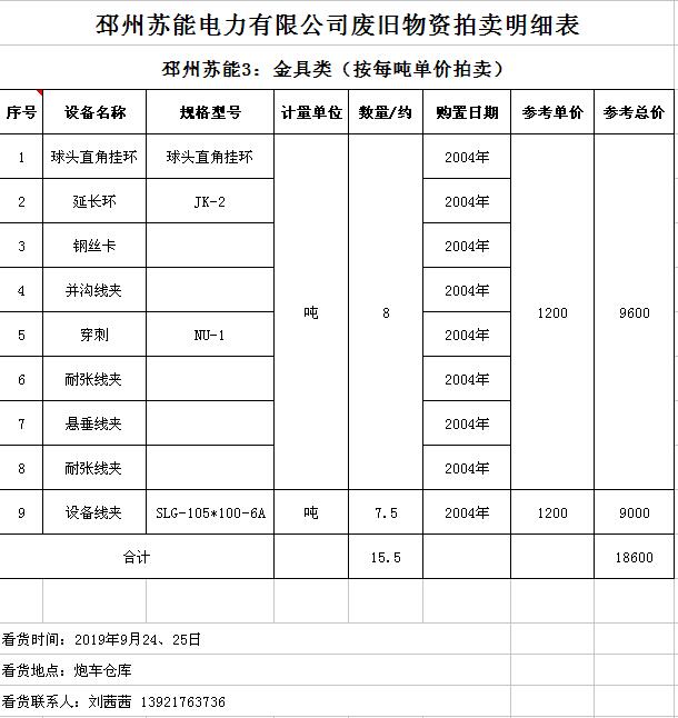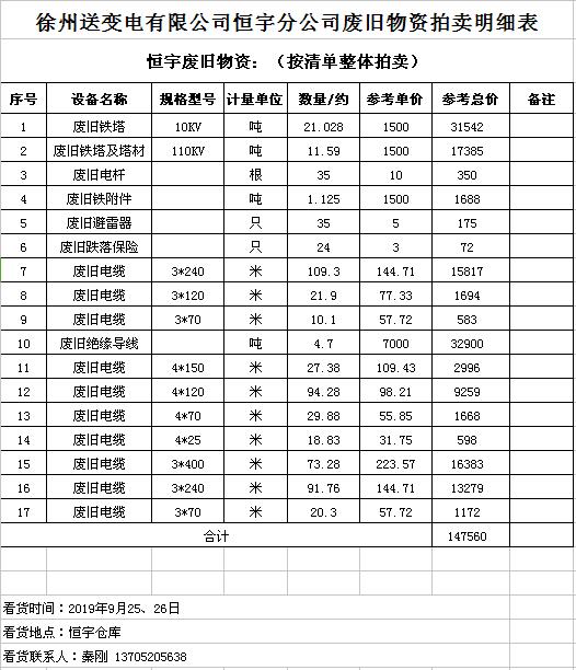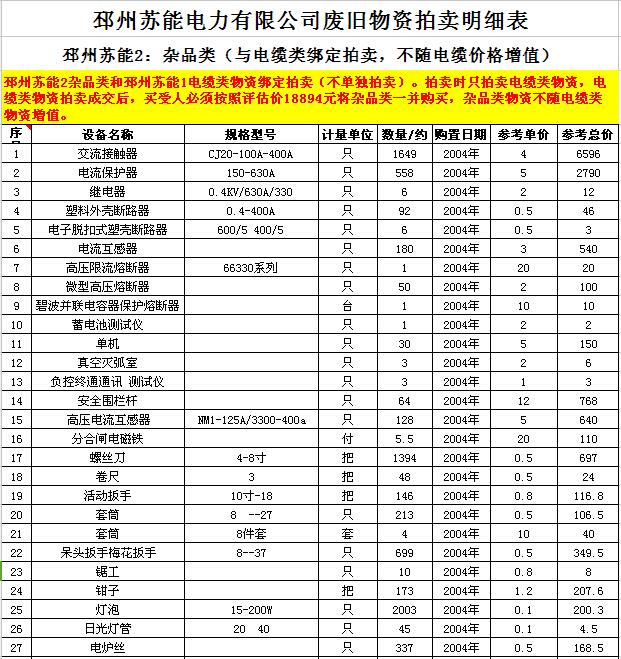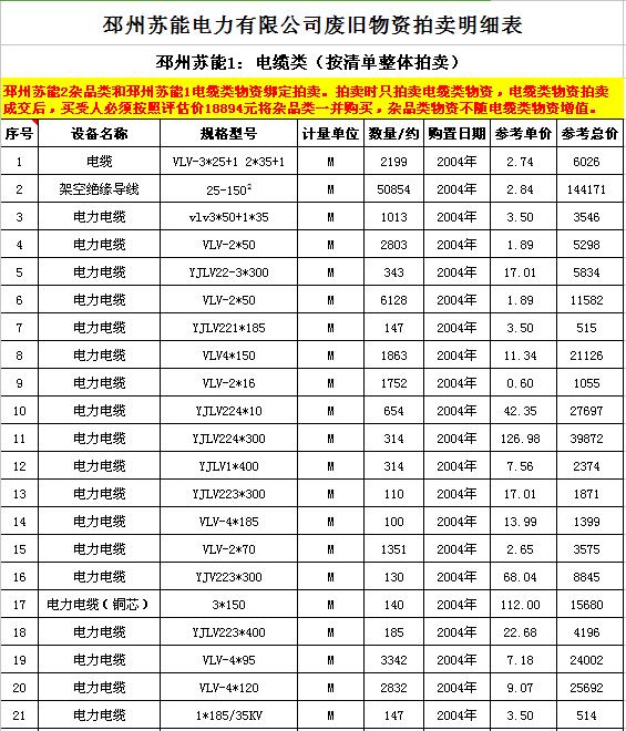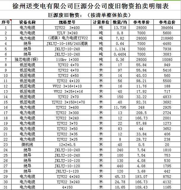 關(guān)注微信公眾號(hào)受委托,我公司將通過(guò)中國(guó)拍賣(mài)行業(yè)協(xié)會(huì)網(wǎng)絡(luò)拍賣(mài)平臺(tái)以網(wǎng)絡(luò)競(jìng)價(jià)的方式公開(kāi)拍賣(mài)廢舊電力物資一批,主要包括:電纜、導(dǎo)線、廢舊鋼材、鋼芯鋁絞線、金具、雜品、機(jī)具、空調(diào)、辦公設(shè)備等。