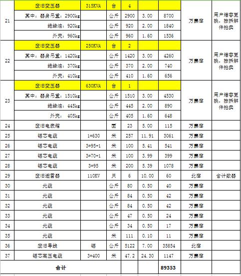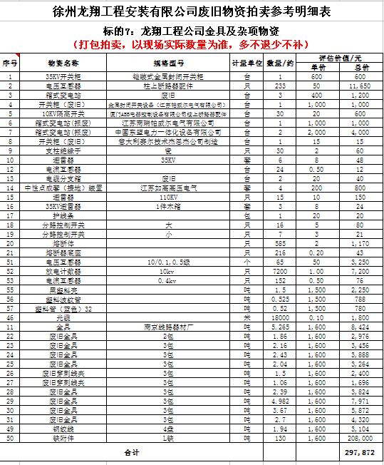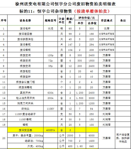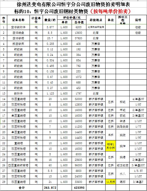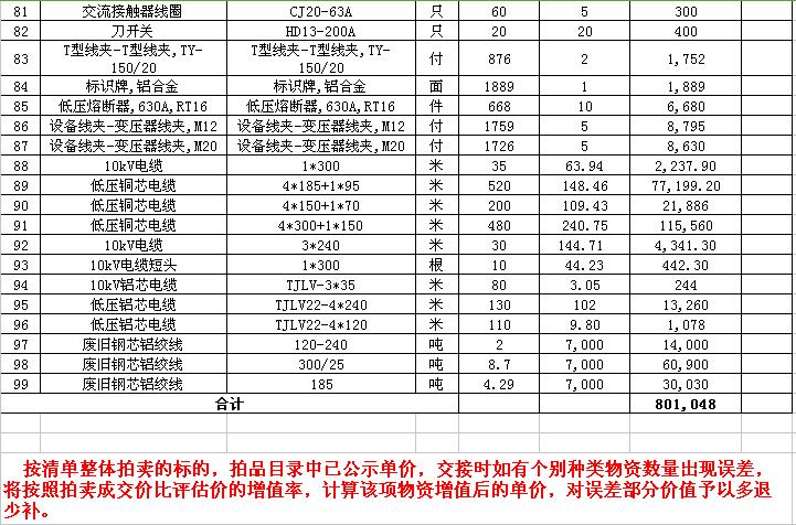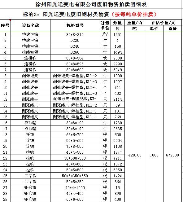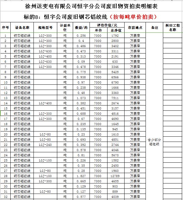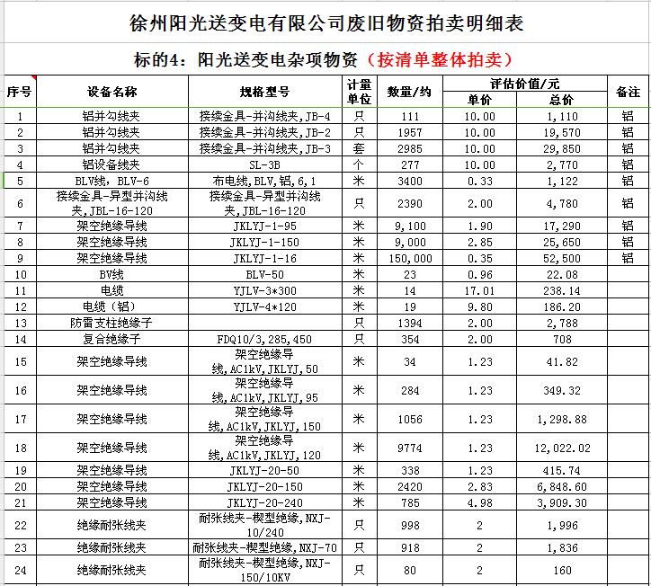 關(guān)注微信公眾號受委托,我公司將通過中國拍賣行業(yè)協(xié)會網(wǎng)絡(luò)拍賣平臺以網(wǎng)絡(luò)競價(jià)的方式公開拍賣以下公司廢舊電力物資。主要包含:廢銅排下腳料、廢不銹鋼、辦公設(shè)備等;架空絕緣導(dǎo)線、電纜、金具、角鋼塔、鋼芯鋁絞線、開關(guān)、互感器、變壓器散件等。