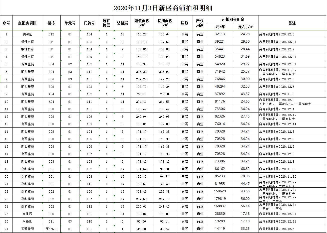 關(guān)注微信公眾號我公司受委托,定于2020年11月3日9:30在徐州云泉山莊第七會議室公開拍租以下社區(qū)房屋:潤和園、楓情水岸、湖西雅苑、嘉和雅苑、尚景園、玉潭佳苑、漢襄佳苑、華盛景園、祥云路街坊中心二層等。拍租房屋共34處,商鋪面積分別約為數(shù)十至數(shù)百平米,祥云路街坊中心二層約2490平米。社區(qū)商鋪租期三年,祥云路街坊中心二層辦公房租期五年。詳情請登錄本公司網(wǎng)站或微信公眾號查詢。