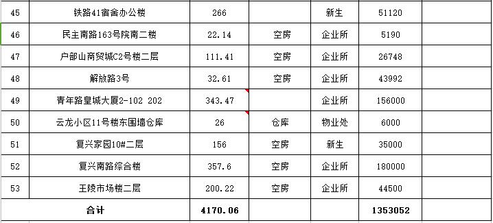 位于銅山路21#辦公房屋15處;位于建國(guó)西路2號(hào)樓辦公房屋5處;位于鐵路3宿舍10處、33宿舍2處、南12宿舍2處、41-42宿舍2處,其他分別位于王陵市場(chǎng)、復(fù)興南路、戶部山商貿(mào)城、皇城大廈、解放路3號(hào)、南門橋綜合樓等地。