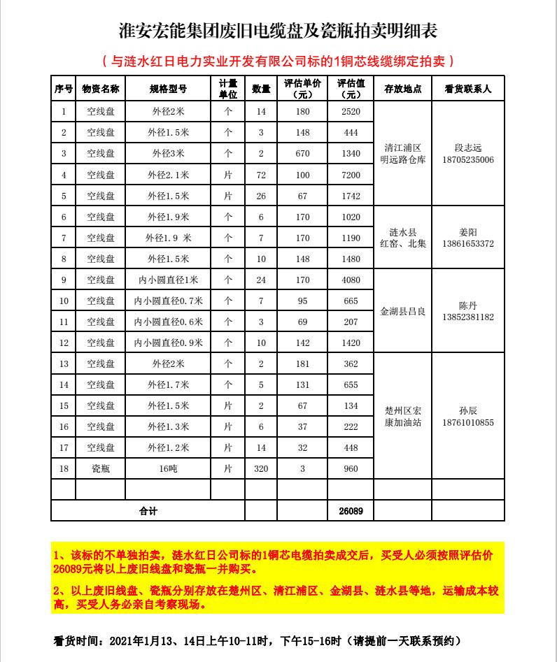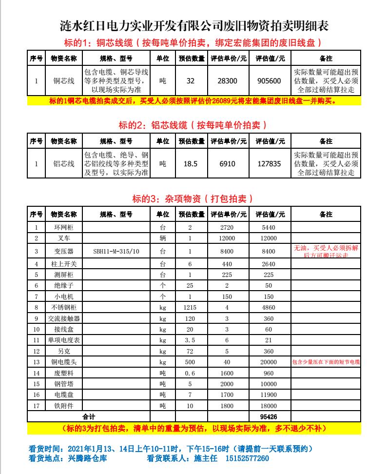 關(guān)注微信公眾號(hào)受委托,我公司將通過(guò)中拍平臺(tái)以網(wǎng)絡(luò)競(jìng)價(jià)的方式公開(kāi)拍賣以下單位廢舊電力物資。主要包含:廢舊電纜盤(pán)、銅芯電纜、鋁芯電纜、鋼管塔、鐵附件、開(kāi)關(guān)柜、變壓器、雜項(xiàng)物資等。