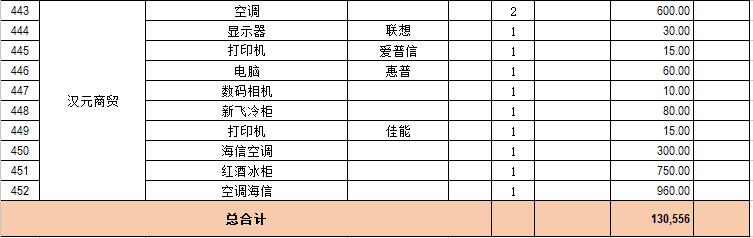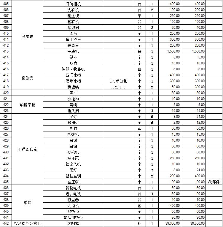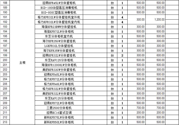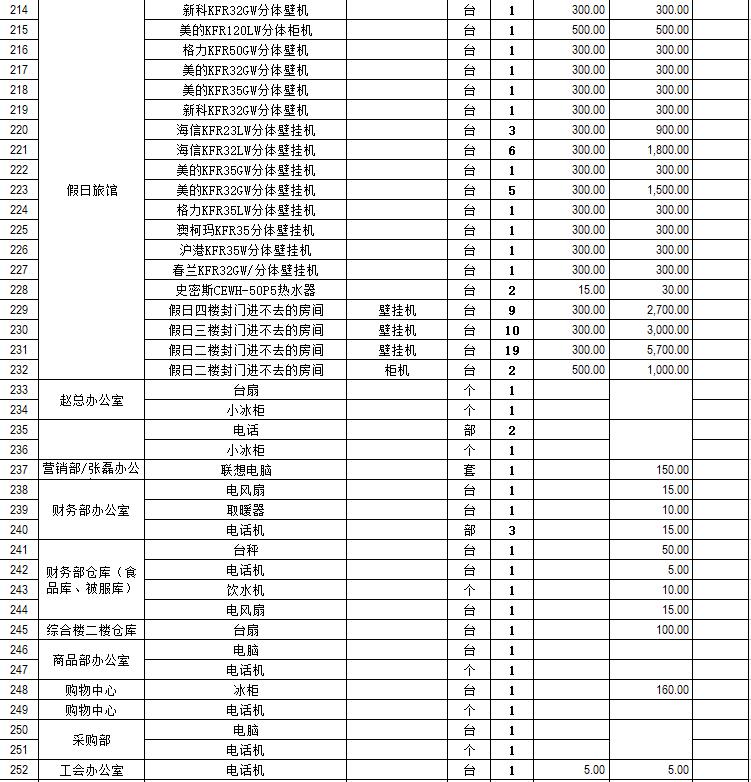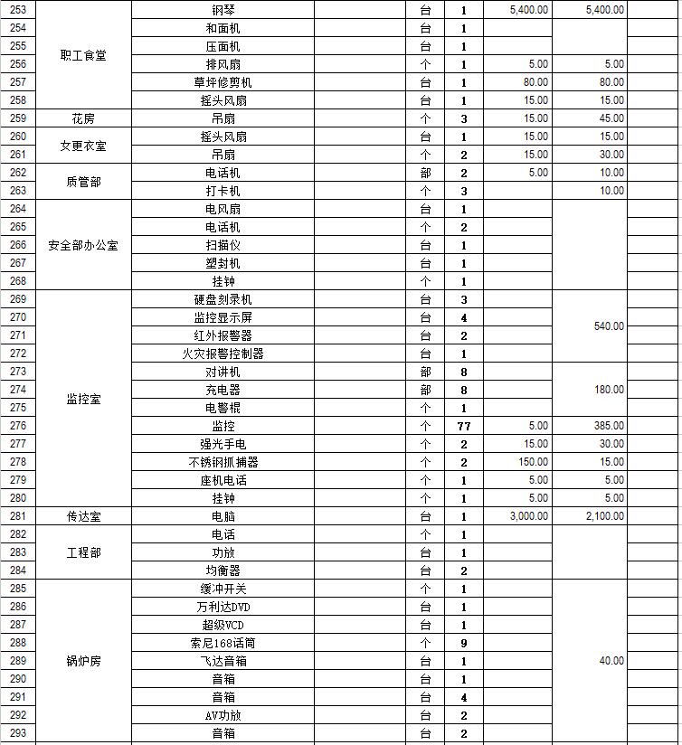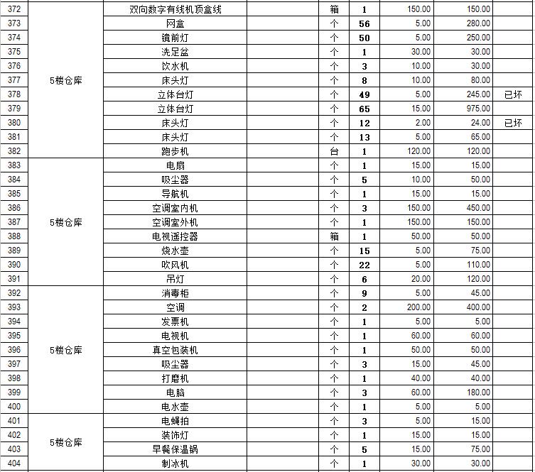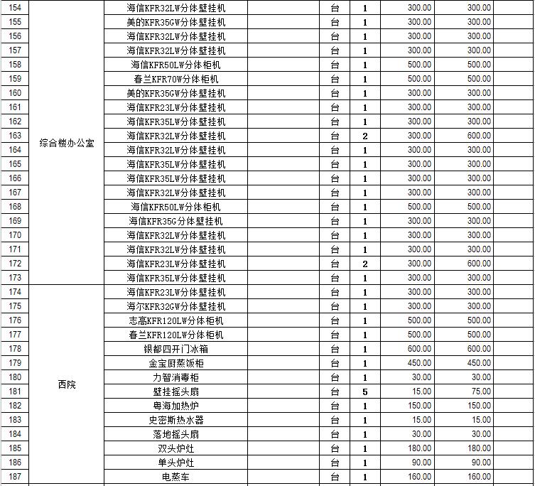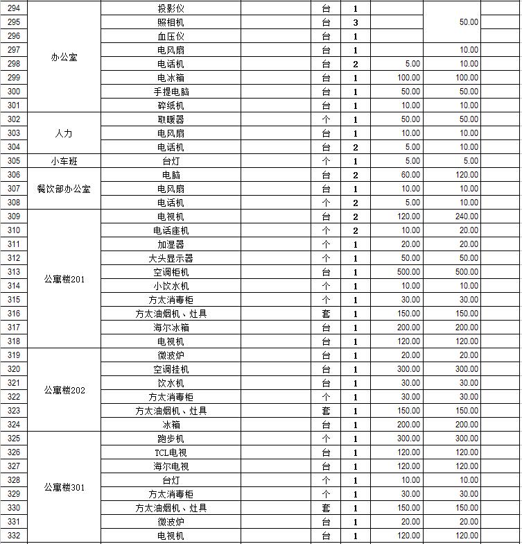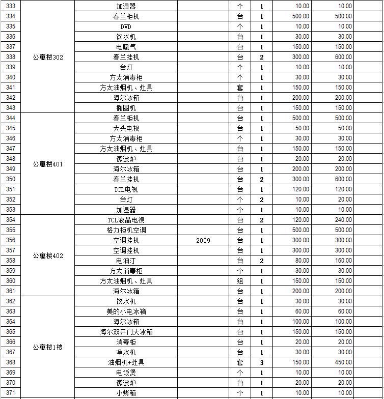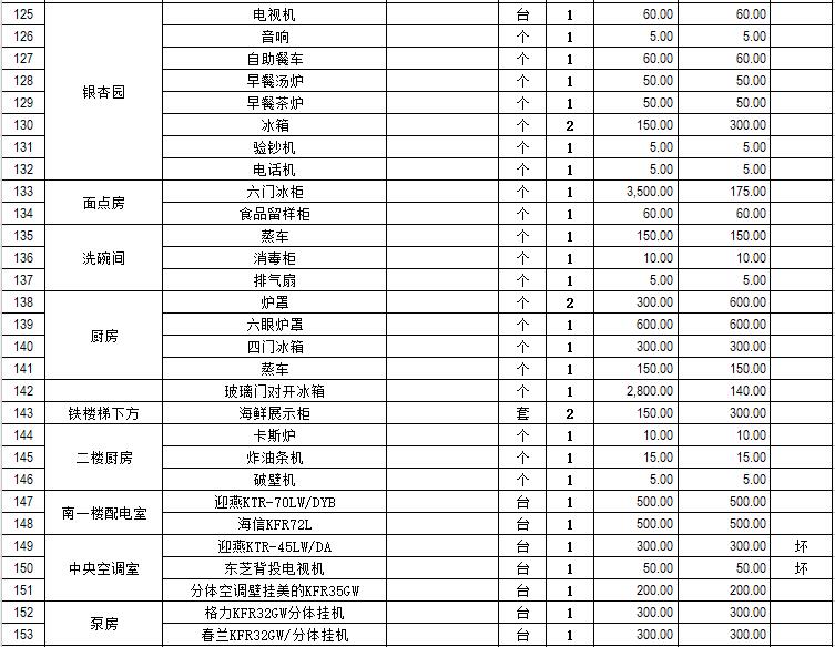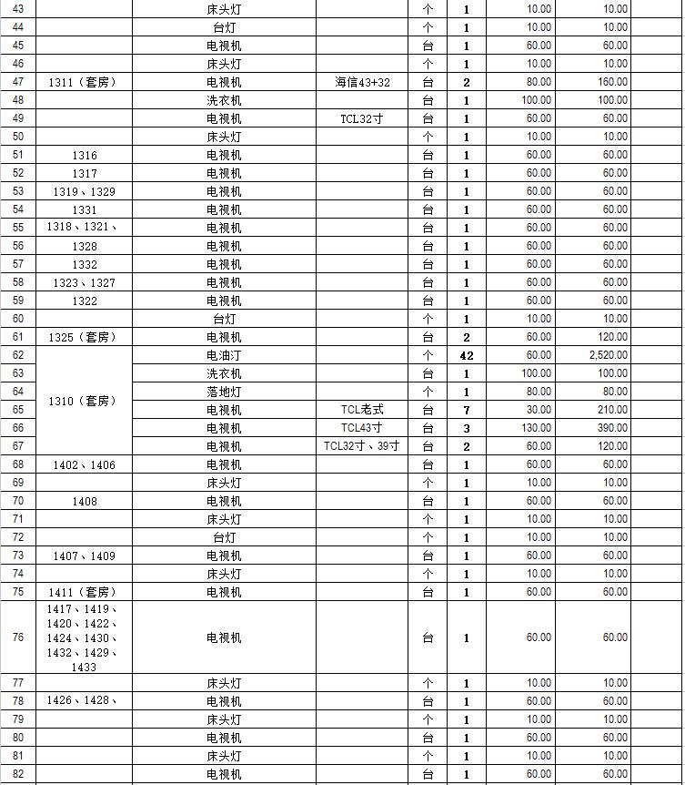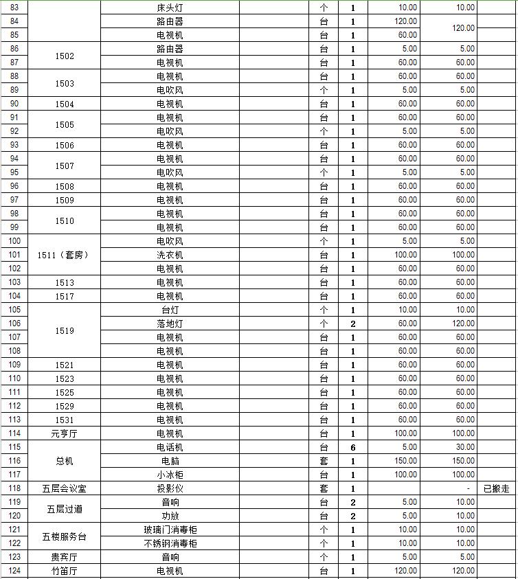 電器設(shè)備主要包含:電視機、空調(diào)、冰箱、消毒柜、電風扇、燈具、電腦、音響設(shè)備、廚房不銹鋼灶具等。