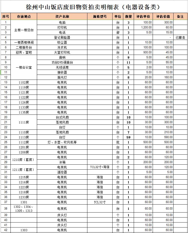 關(guān)注微信公眾號我公司受委托,定于2021年1月18日10時在中拍平臺通過網(wǎng)絡(luò)競拍方式公開拍賣:徐州市中山飯店、漢元商貿(mào)公司廢舊物資一批,主要包括廢舊電器設(shè)備、酒店用具等。