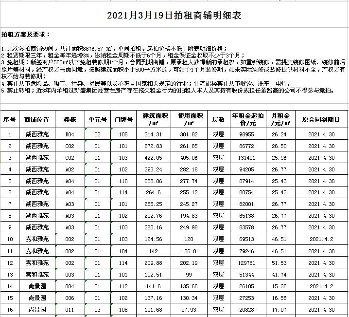 關(guān)注微信公眾號(hào)我公司受委托,定于2021年3月19日9:30時(shí)在徐州市云泉山莊主樓3樓第七會(huì)議廳公開(kāi)拍租以下商鋪:湖西雅苑16間、嘉和雅苑5間、漢襄佳苑6間、尚景園5間、玉潭佳苑8間、紫荊園2間、玉棠苑1間、楓情水岸4間、和風(fēng)雅致12間。面積分別約為數(shù)十至三百余平米不等,租期均為三年。