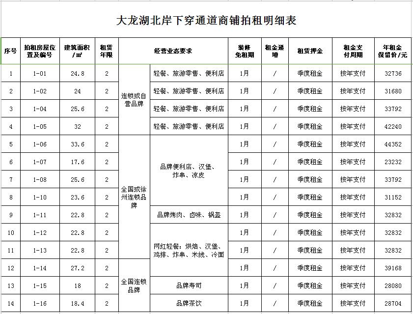 ②拍租順序自明細(xì)表序號14-1(16號商鋪-1號商鋪)依次競拍,為保證商鋪經(jīng)營業(yè)態(tài)的合理性,已競拍成功的品類或品牌不再重復(fù)競拍;
