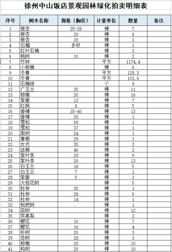 關(guān)注微信公眾號(hào) 受委托,我公司定于2021年5月8日10通過(guò)中拍平臺(tái)公開(kāi)拍賣(mài):徐州市中山飯店景觀樹(shù)一批。主要包含:銀杏、廣玉蘭、冬青、紫薇、香樟、梨樹(shù)、松鼠、青桐、女貞、法桐、白玉蘭、杜仲、水杉、冬青、海棠、竹林等。