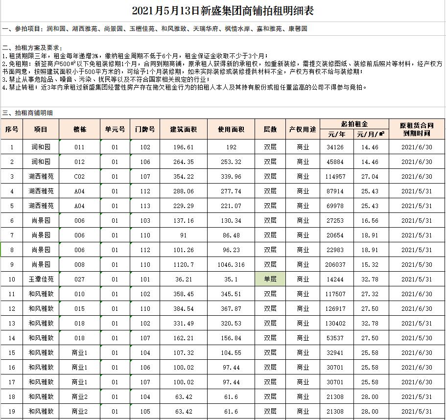 關注微信公眾號我公司受委托,定于2021年5月13日9:30時在徐州市中山南路55號本公司拍賣廳公開拍租以下商鋪:湖西雅苑14間、嘉和雅苑3間、尚景園11間、玉潭佳苑4間、紫荊園2間、康馨園3間、楓情水岸2間、潤和園3間、天瑞華府1間、和風雅致21間。面積分別約為數十至三百余平米不等,租期均為三年。